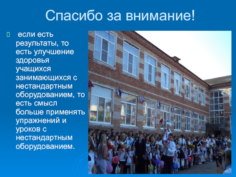 Я считаю, что гипотезу, которая нами была выдвинута, достигла своих подтверждений. С использованием нестандартного оборудования у детей начинает формироваться интерес к урокам физкультуры и укрепляется здоровье: