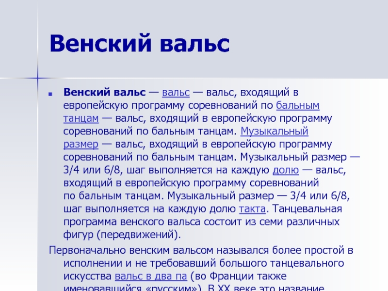 Венский вальс — вальс — вальс, входящий в европейскую программу соревнований по бальным танцам — вальс, входящий
