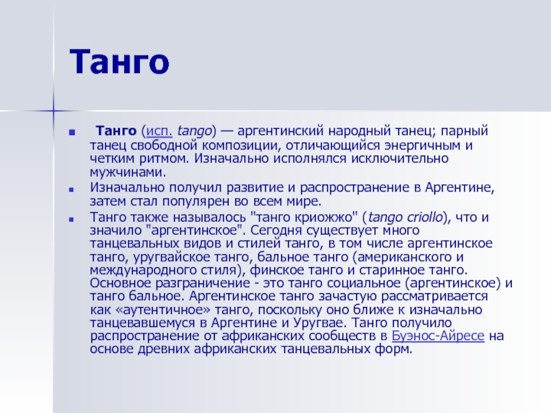 Танго (исп. tango) — аргентинский народный танец; парный танец свободной композиции, отличающийся энергичным