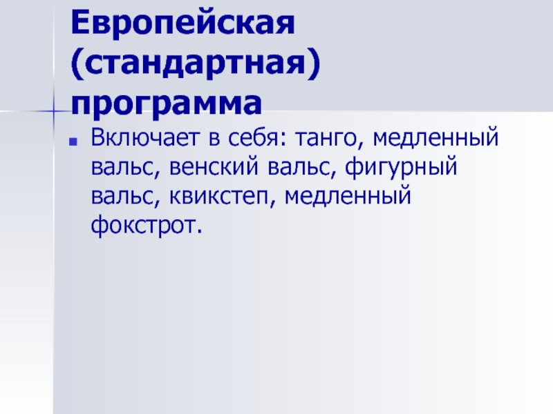 Включает в себя: танго, медленный вальс, венский вальс, фигурный