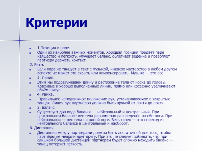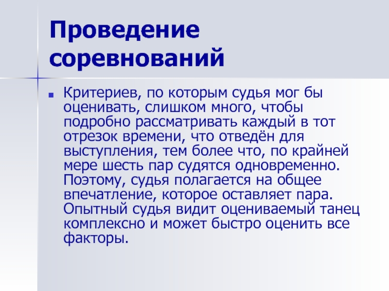 подробно рассматривать каждый в тот отрезок времени, что отведён для выступления, тем более что, по крайней мере шесть пар судятся одновременно. Поэтому, судья полагается на общее впечатление, которое оставляет пара. Опытный судья видит оцениваемый танец комплексно и может быстро оценить все факторы.