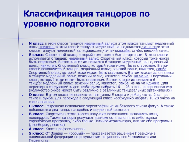 E класс: Спортивный класс, который тоже может быть стартовым. В этом классе исполняется 6 танцев: медленный вальс: Спортивный класс, который тоже может быть стартовым. В этом классе исполняется 6 танцев: медленный вальс, венский вальс, квикстеп: Спортивный класс, который тоже может быть стартовым. В этом классе исполняется 6 танцев: медленный вальс, венский вальс, квикстеп, самба: Спортивный класс, который тоже может быть стартовым. В этом классе исполняется 6 танцев: медленный вальс, венский вальс, квикстеп, самба, ча-ча-ча: Спортивный класс, который тоже может быть стартовым. В этом классе исполняется 6 танцев: медленный вальс, венский вальс, квикстеп, самба, ча-ча-ча иджайв. Для перехода в следующий класс необходимо набрать 16 — 26 очков на соревнованиях (количество очков может быть различно в различных танцевальных организациях)