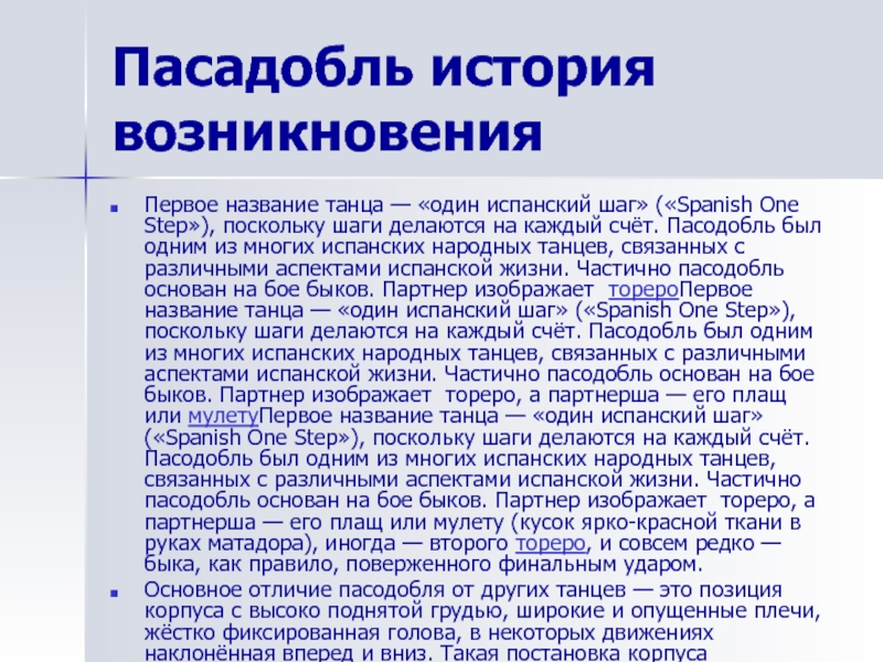 поскольку шаги делаются на каждый счёт. Пасодобль был одним из многих испанских народных танцев, связанных с различными аспектами испанской жизни. Частично пасодобль основан на бое быков. Партнер изображает торероПервое название танца — «один испанский шаг» («Spanish One Step»), поскольку шаги делаются на каждый счёт. Пасодобль был одним из многих испанских народных танцев, связанных с различными аспектами испанской жизни. Частично пасодобль основан на бое быков. Партнер изображает тореро, а партнерша — его плащ или мулетуПервое название танца — «один испанский шаг» («Spanish One Step»), поскольку шаги делаются на каждый счёт. Пасодобль был одним из многих испанских народных танцев, связанных с различными аспектами испанской жизни. Частично пасодобль основан на бое быков. Партнер изображает тореро, а партнерша — его плащ или мулету (кусок ярко-красной ткани в руках матадора), иногда — второго тореро, и совсем редко — быка, как правило, поверженного финальным ударом.