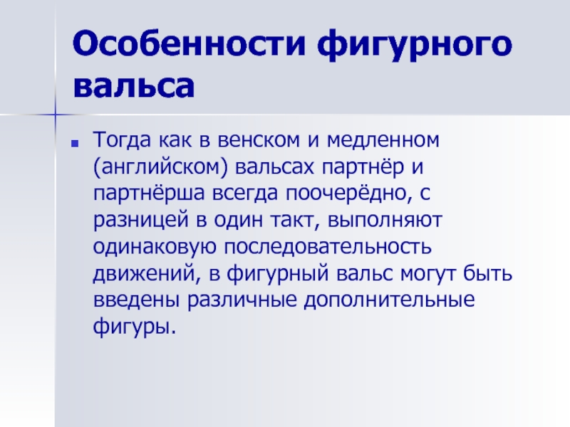 и партнёрша всегда поочерёдно, с разницей в один такт, выполняют одинаковую последовательность движений, в фигурный вальс могут быть введены различные дополнительные фигуры.