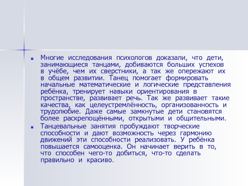 в учёбе, чем их сверстники, а так же опережают их в общем развитии. Танец помогает формировать начальные математические и логические представления ребёнка, тренирует навыки ориентирования в пространстве, развивает речь. Так же развивает такие качества, как целеустремлённость, организованность и трудолюбие. Даже самые замкнутые дети становятся более раскрепощёнными, открытыми и общительными.