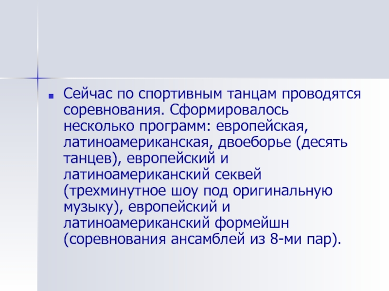 Сейчас по спортивным танцам проводятся соревнования. Сформировалось несколько программ: европейская, латиноамериканская,