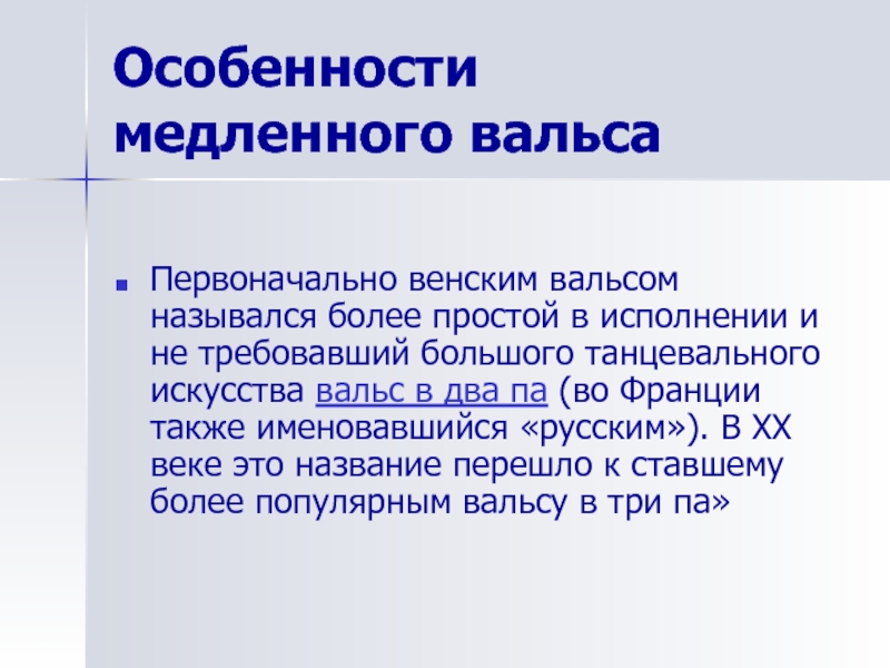 не требовавший большого танцевального искусства вальс в два па (во Франции также именовавшийся «русским»). В XX веке это название перешло к ставшему более популярным вальсу в три па»