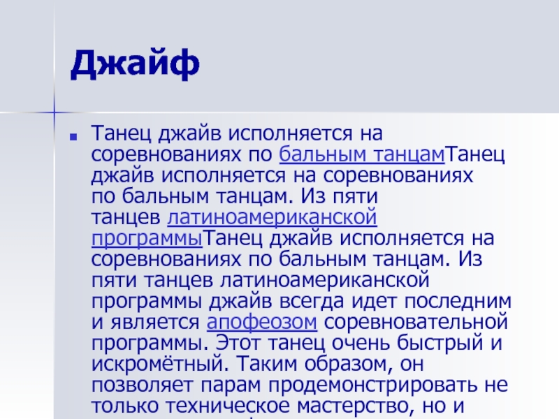 по бальным танцам. Из пяти танцев латиноамериканской программыТанец джайв исполняется на соревнованиях по бальным танцам. Из пяти танцев латиноамериканской программы джайв всегда идет последним и является апофеозом соревновательной программы. Этот танец очень быстрый и искромётный. Таким образом, он позволяет парам продемонстрировать не только техническое мастерство, но и показать свою физическую подготовку.