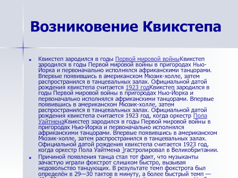 войны в пригородах Нью-Йорка и первоначально исполнялся африканскими танцорами. Впервые появившись в американском Мюзик-холле, затем распространился в танцевальных залах. Официальной датой рождения квикстепа считается 1923 годКвикстеп зародился в годы Первой мировой войны в пригородах Нью-Йорка и первоначально исполнялся африканскими танцорами. Впервые появившись в американском Мюзик-холле, затем распространился в танцевальных залах. Официальной датой рождения квикстепа считается 1923 год, когда оркестр Пола УайтменаКвикстеп зародился в годы Первой мировой войны в пригородах Нью-Йорка и первоначально исполнялся африканскими танцорами. Впервые появившись в американском Мюзик-холле, затем распространился в танцевальных залах. Официальной датой рождения квикстепа считается 1923 год, когда оркестр Пола Уайтмена ]гастролировал в Великобритании.