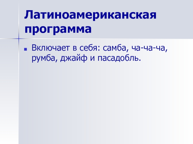 Включает в себя: самба, ча-ча-ча, румба, джайф и пасадобль.