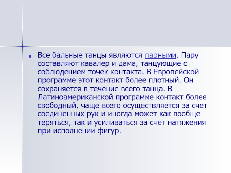 соблюдением точек контакта. В Европейской программе этот контакт более плотный. Он сохраняется в течение всего танца. В Латиноамериканской программе контакт более свободный, чаще всего осуществляется за счет соединенных рук и иногда может как вообще теряться, так и усиливаться за счет натяжения при исполнении фигур.
