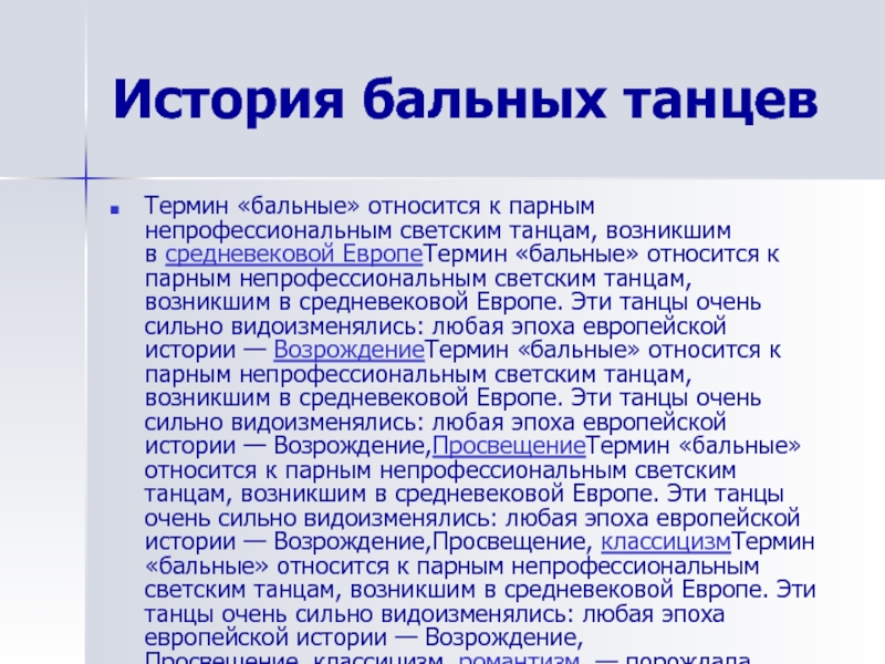 в средневековой ЕвропеТермин «бальные» относится к парным непрофессиональным светским танцам, возникшим в средневековой Европе. Эти танцы очень сильно видоизменялись: любая эпоха европейской истории — ВозрождениеТермин «бальные» относится к парным непрофессиональным светским танцам, возникшим в средневековой Европе. Эти танцы очень сильно видоизменялись: любая эпоха европейской истории — Возрождение,ПросвещениеТермин «бальные» относится к парным непрофессиональным светским танцам, возникшим в средневековой Европе. Эти танцы очень сильно видоизменялись: любая эпоха европейской истории — Возрождение,Просвещение, классицизмТермин «бальные» относится к парным непрофессиональным светским танцам, возникшим в средневековой Европе. Эти танцы очень сильно видоизменялись: любая эпоха европейской истории — Возрождение,Просвещение, классицизм, романтизм, — порождала своеобразный танцевальный комплекс. На протяжении всего европейского культурного развития на бальный танец влияли самые разнообразные этнические источники, а также профессиональный танец.