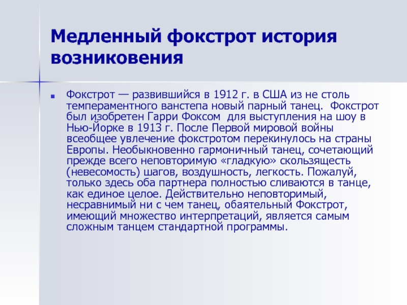 из не столь темпераментного ванстепа новый парный танец. Фокстрот был изобретен Гарри Фоксом для выступления на шоу в Нью-Йорке в 1913 г. После Первой мировой войны всеобщее увлечение фокстротом перекинулось на страны Европы. Необыкновенно гармоничный танец, сочетающий прежде всего неповторимую «гладкую» скользящесть (невесомость) шагов, воздушность, легкость. Пожалуй, только здесь оба партнера полностью сливаются в танце, как единое целое. Действительно неповторимый, несравнимый ни с чем танец, обаятельный Фокстрот, имеющий множество интерпретаций, является самым сложным танцем стандартной программы.