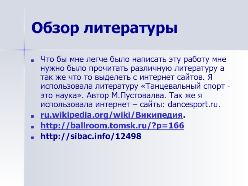 было прочитать различную литературу а так же что то выделеть с интернет сайтов. Я использовала литературу «Танцевальный спорт - это наука». Автор М.Пустовалва. Так же я использовала интернет – сайты: dancesport.ru.