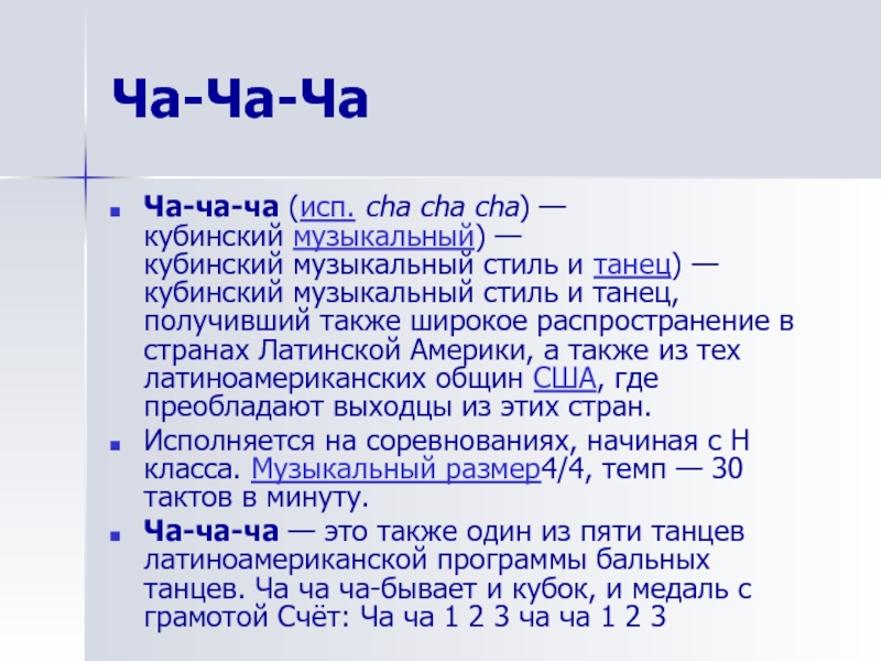 Ча-ча-ча (исп. cha cha cha) — кубинский музыкальный) — кубинский музыкальный стиль и танец) — кубинский музыкальный стиль и танец, получивший также