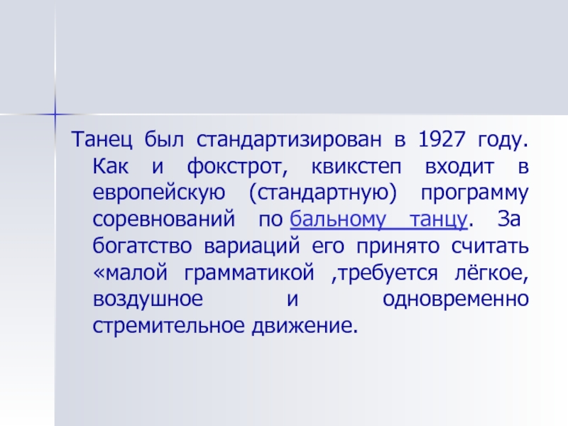 Танец был стандартизирован в 1927 году. Как и фокстрот, квикстеп входит
