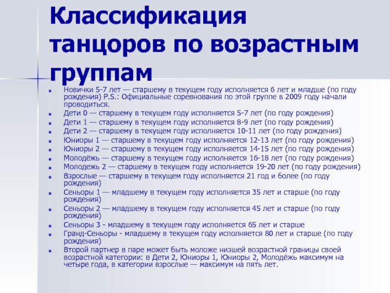 Второй партнер в паре может быть моложе низшей возрастной границы своей возрастной категории: в Дети 2, Юниоры 1, Юниоры 2, Молодёжь максимум на четыре года, в категории взрослые — максимум на пять лет.