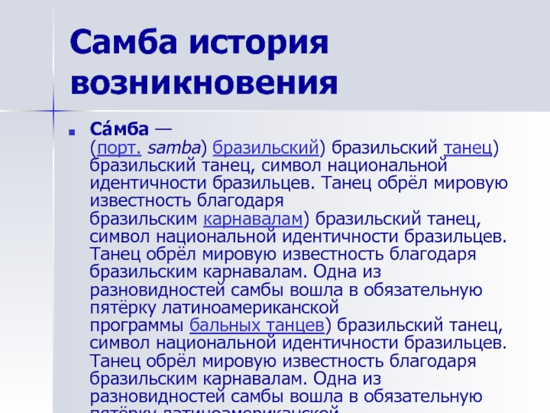 известность благодаря бразильским карнавалам) бразильский танец, символ национальной идентичности бразильцев. Танец обрёл мировую известность благодаря бразильским карнавалам. Одна из разновидностей самбы вошла в обязательную пятёрку латиноамериканской программы бальных танцев) бразильский танец, символ национальной идентичности бразильцев. Танец обрёл мировую известность благодаря бразильским карнавалам. Одна из разновидностей самбы вошла в обязательную пятёрку латиноамериканской программы бальных танцев. Исполняется втемпе) бразильский танец, символ национальной идентичности бразильцев. Танец обрёл мировую известность благодаря бразильским карнавалам. Одна из разновидностей самбы вошла в обязательную пятёрку латиноамериканской программы бальных танцев. Исполняется втемпе 50-52 удара в минуту, в размере) бразильский танец, символ национальной идентичности бразильцев. Танец обрёл мировую известность благодаря бразильским карнавалам. Одна из разновидностей самбы вошла в обязательную пятёрку латиноамериканской программы бальных танцев. Исполняется втемпе 50-52 удара в минуту, в размере 2/4 или 4/4. В русском языке слово "самба" имеет женский род, в португальском – мужской. Самба - это бразильский танец, который уходит корнями в штат Баия. Карнавал давно превратился в соревнования, на которых разные школы самбы соревнуются за звание "Лучшей школы самбы".