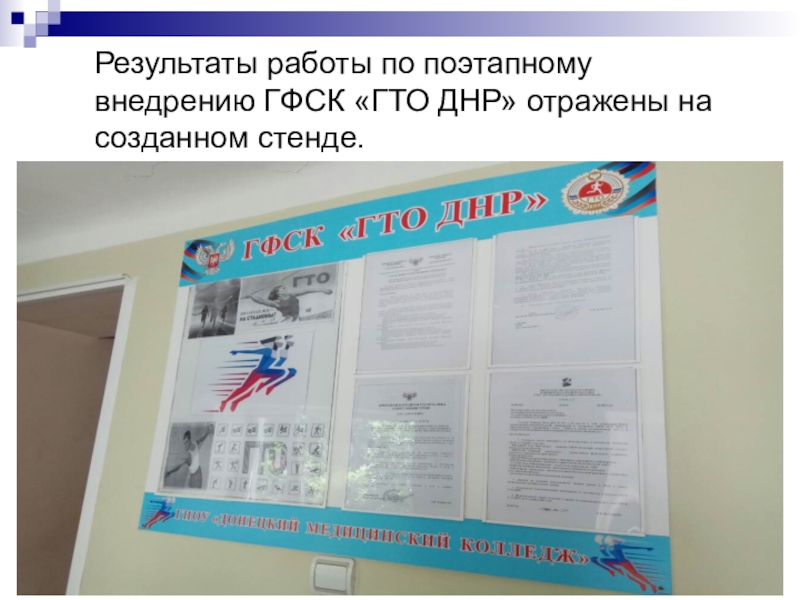 Слайд 14Результаты работы по поэтапному внедрению ГФСК «ГТО ДНР» отражены на созданном