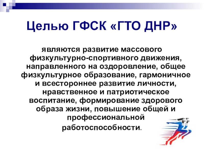 Слайд 7Целью ГФСК «ГТО ДНР»