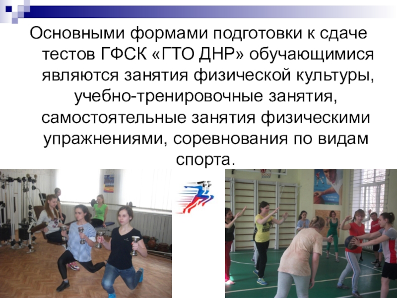 Слайд 13Основными формами подготовки к сдаче тестов ГФСК «ГТО ДНР» обучающимися являются