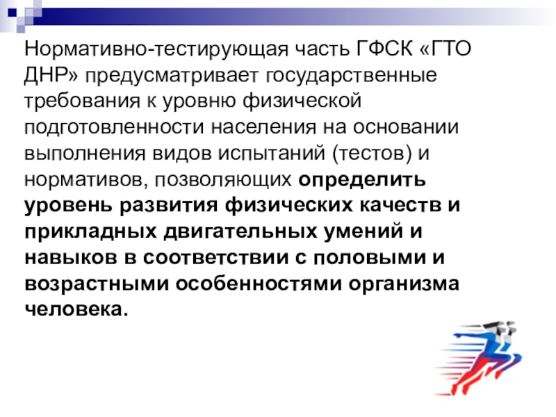 Слайд 9Нормативно-тестирующая часть ГФСК «ГТО ДНР» предусматривает государственные требования к уровню физической
