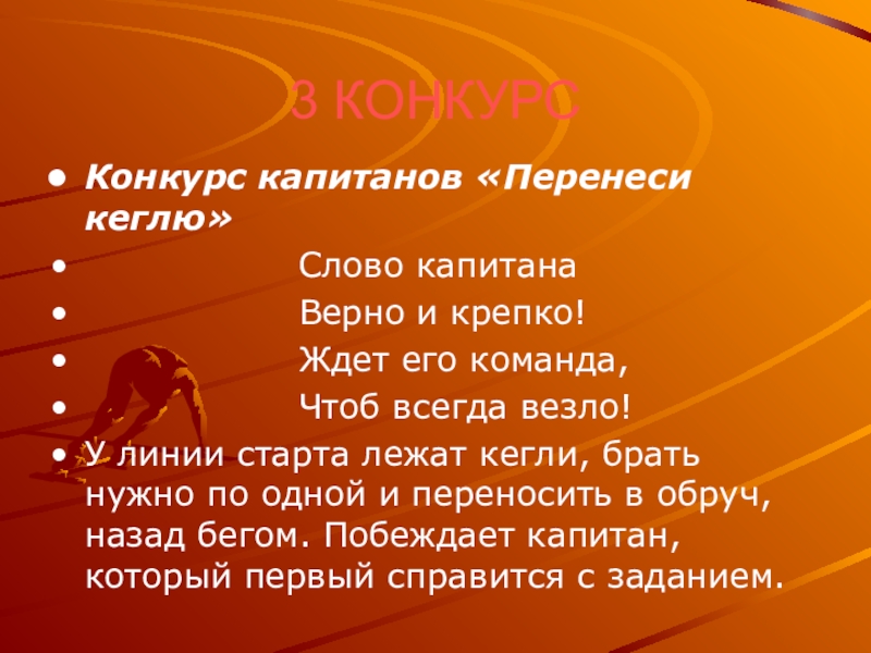 У линии старта лежат кегли, брать нужно по одной и переносить в обруч, назад бегом. Побеждает капитан, который первый справится с заданием.