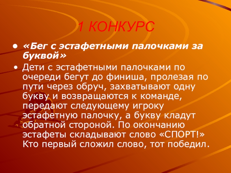 очереди бегут до финиша, пролезая по пути через обруч, захватывают одну букву и возвращаются к команде, передают следующему игроку эстафетную палочку, а букву кладут обратной стороной. По окончанию эстафеты складывают слово «СПОРТ!» Кто первый сложил слово, тот победил.