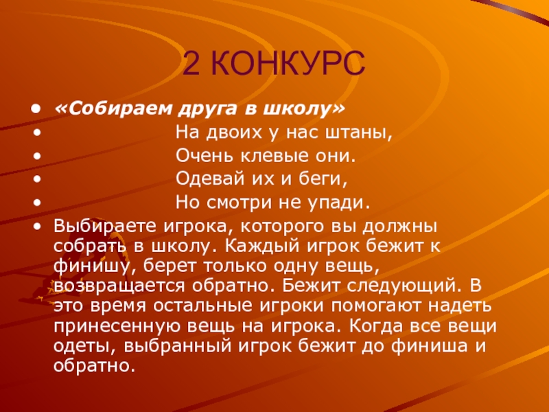 Выбираете игрока, которого вы должны собрать в школу. Каждый игрок бежит к финишу, берет только одну вещь, возвращается обратно. Бежит следующий. В это время остальные игроки помогают надеть принесенную вещь на игрока. Когда все вещи одеты, выбранный игрок бежит до финиша и обратно.