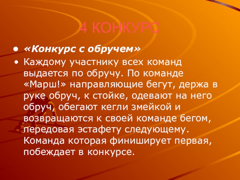 команде «Марш!» направляющие бегут, держа в руке обруч, к стойке, одевают на него обруч, обегают кегли змейкой и возвращаются к своей команде бегом, передовая эстафету следующему. Команда которая финиширует первая, побеждает в конкурсе.