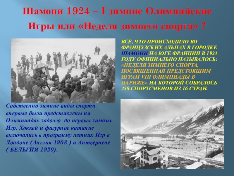 Всё, что происходило во Французских Альпах в городке Шамони на юге Франции в 1924 году официально называлось: «Неделя зимнего спорта, посвященная предстоящим Играм VIII Олимпиады в Париже» на которой собралось 258 спортсменов из 16 стран.