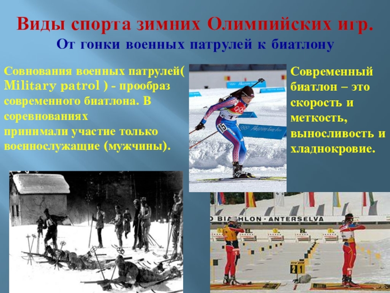 Совнования военных патрулей( Military patrol ) - прообраз современного биатлона. В соревнованиях