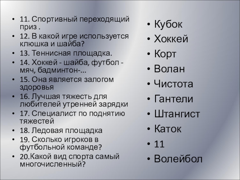 11. Спортивный переходящий приз . 12. В какой игре используется клюшка и шайба?13. Теннисная площадка. 14. Хоккей