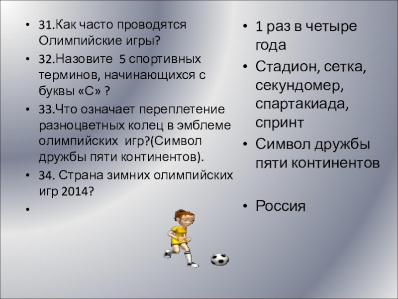31.Как часто проводятся Олимпийские игры?32.Назовите 5 спортивных терминов, начинающихся с буквы «С» ? 33.Что означает переплетение разноцветных