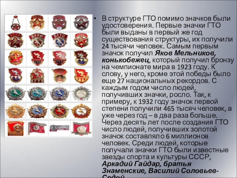выданы в первый же год существования структуры, их получили 24 тысячи человек. Самым первым значок получил Яков Мельников, конькобежец, который получил бронзу на чемпионате мира в 1923 году. К слову, у него, кроме этой победы было еще 27 национальных рекордов. С каждым годом число людей, получивших значки, росло. Так, к примеру, к 1932 году значок первой степени получили 465 тысяч человек, а уже через год – в два раза больше. Через десять лет после создания ГТО число людей, получивших золотой значок составляло 6 миллионов человек. Среди людей, которые получали значки ГТО были известные звезды спорта и культуры СССР, Аркадий Гайдар, братья Знаменские, Василий Соловьев-Седой.