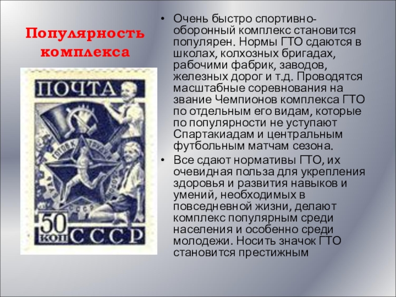 Популярность комплексаОчень быстро спортивно-оборонный комплекс становится популярен. Нормы ГТО сдаются в школах, колхозных бригадах, рабочими фабрик, заводов,