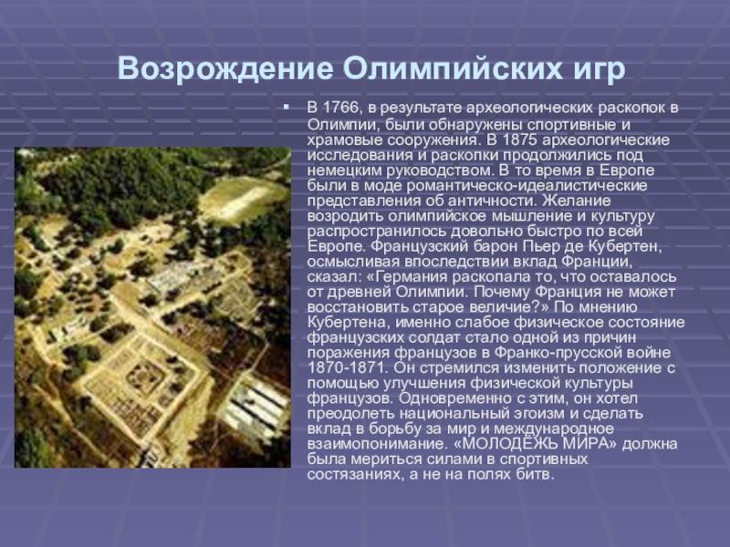 обнаружены спортивные и храмовые сооружения. В 1875 археологические исследования и раскопки продолжились под немецким руководством. В то время в Европе были в моде романтическо-идеалистические представления об античности. Желание возродить олимпийское мышление и культуру распространилось довольно быстро по всей Европе. Французский барон Пьер де Кубертен, осмысливая впоследствии вклад Франции, сказал: «Германия раскопала то, что оставалось от древней Олимпии. Почему Франция не может восстановить старое величие?» По мнению Кубертена, именно слабое физическое состояние французских солдат стало одной из причин поражения французов в Франко-прусской войне 1870-1871. Он стремился изменить положение с помощью улучшения физической культуры французов. Одновременно с этим, он хотел преодолеть национальный эгоизм и сделать вклад в борьбу за мир и международное взаимопонимание. «МОЛОДЁЖЬ МИРА» должна была мериться силами в спортивных состязаниях, а не на полях битв.