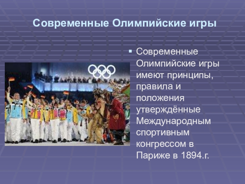 Современные Олимпийские игры имеют принципы, правила и положения утверждённые
