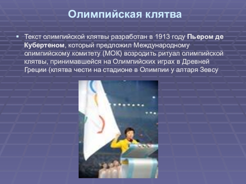 Текст олимпийской клятвы разработан в 1913 году Пьером де Кубертеном, который