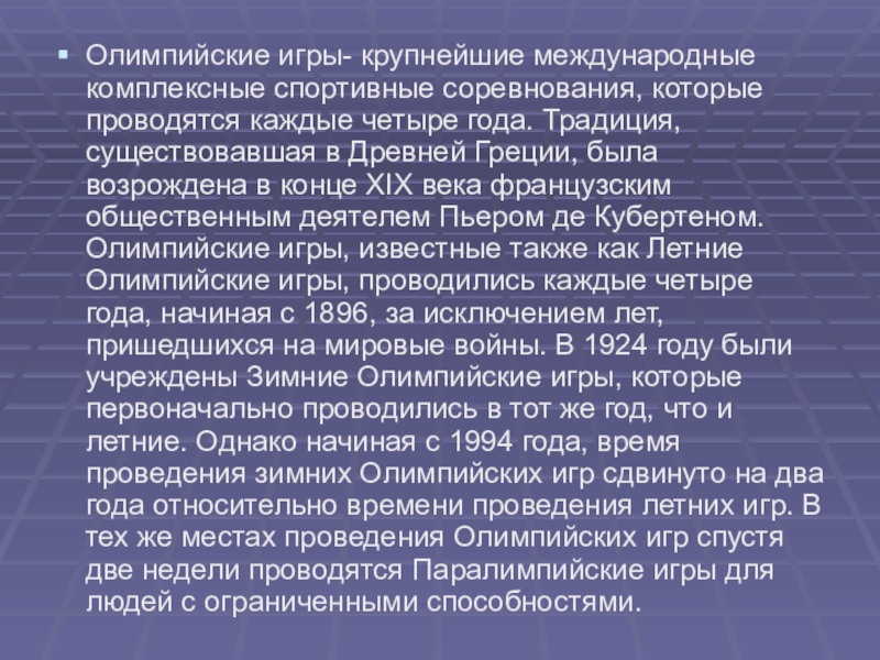 года. Традиция, существовавшая в Древней Греции, была возрождена в конце XIX века французским общественным деятелем Пьером де Кубертеном. Олимпийские игры, известные также как Летние Олимпийские игры, проводились каждые четыре года, начиная с 1896, за исключением лет, пришедшихся на мировые войны. В 1924 году были учреждены Зимние Олимпийские игры, которые первоначально проводились в тот же год, что и летние. Однако начиная с 1994 года, время проведения зимних Олимпийских игр сдвинуто на два года относительно времени проведения летних игр. В тех же местах проведения Олимпийских игр спустя две недели проводятся Паралимпийские игры для людей с ограниченными способностями.