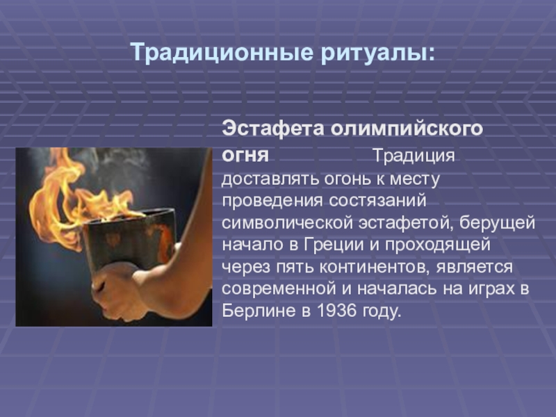 Традиция доставлять огонь к месту проведения состязаний символической эстафетой, берущей начало в Греции и проходящей через пять континентов, является современной и началась на играх в Берлине в 1936 году.