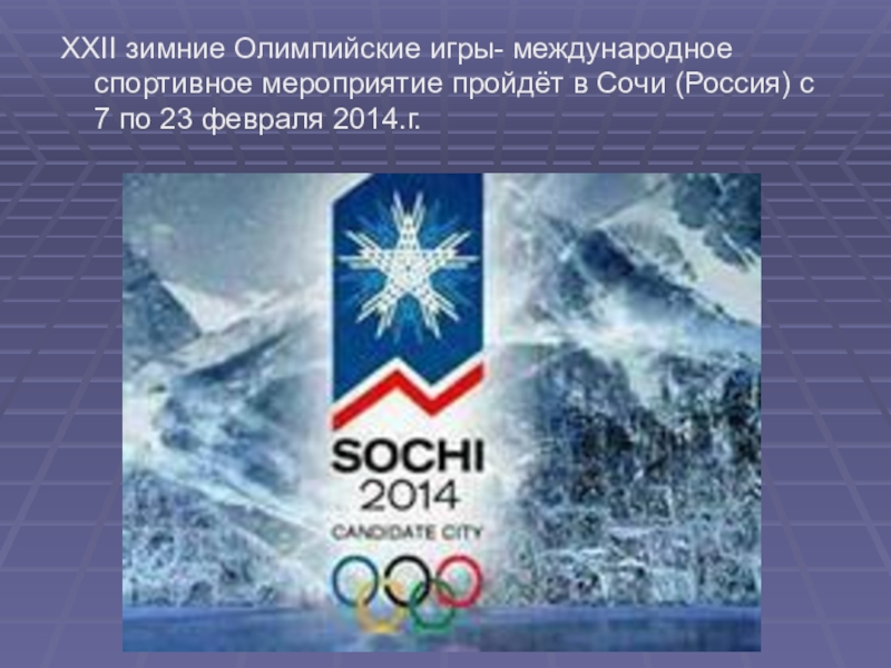 Слайд 20XXII зимние Олимпийские игры- международное спортивное мероприятие пройдёт в Сочи (Россия)