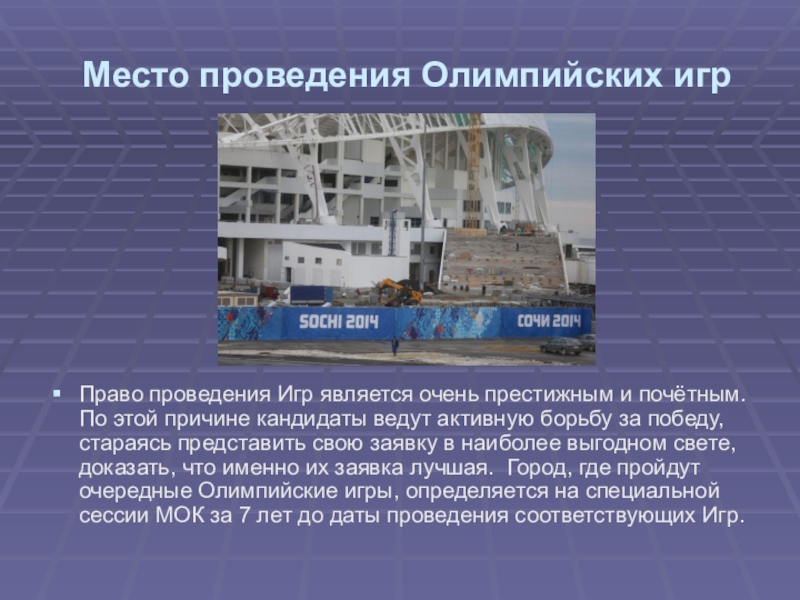По этой причине кандидаты ведут активную борьбу за победу, стараясь представить свою заявку в наиболее выгодном свете, доказать, что именно их заявка лучшая. Город, где пройдут очередные Олимпийские игры, определяется на специальной сессии МОК за 7 лет до даты проведения соответствующих Игр.