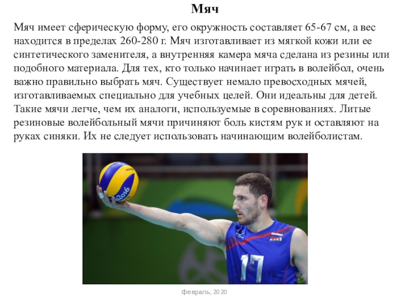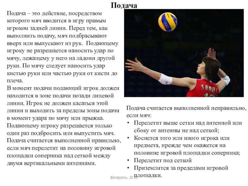 Мяч держите перед собой на левой ладони, поднятой на высоту плеча. Подбросьте мяч перед правым плечом и в то же самое время сделайте замах правой рукой.
