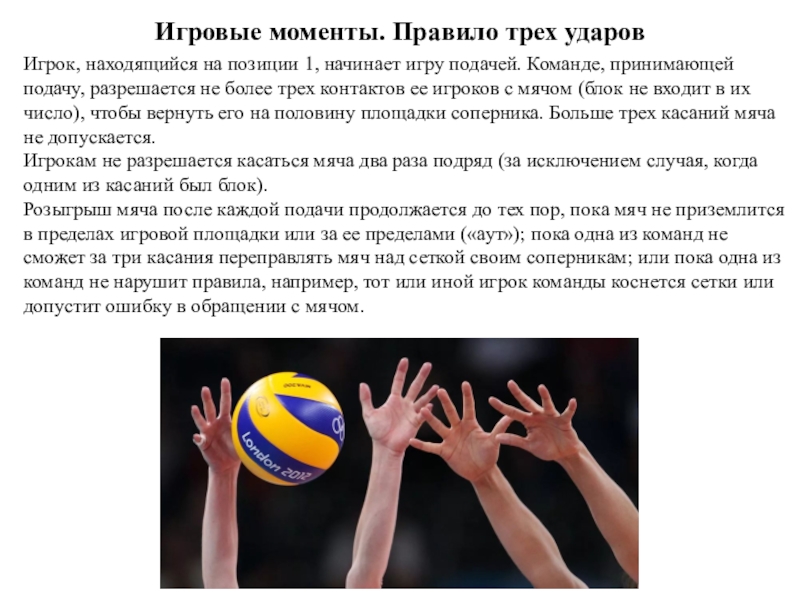 При первом ударе команды по мячу, мяч может последовательно контактировать с разными частями тела, при условии, что эти контакты имеют место во время одного действия, т.е. допускается двойное касание.