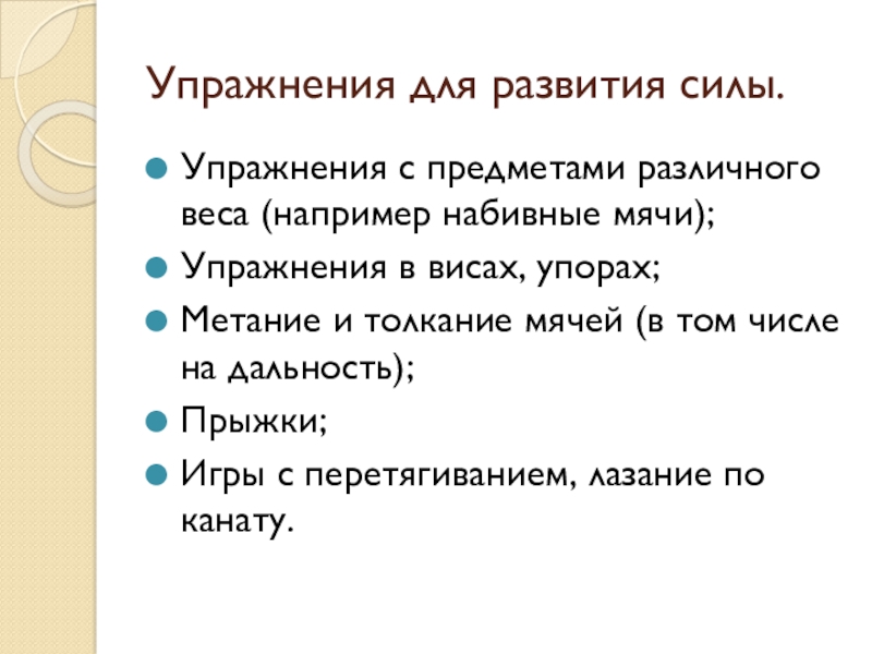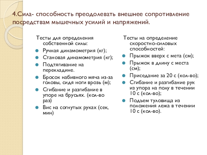 Силовая выносливость – способность длительно выполнять сложные координационные движения с максимальным напряжением мышц, сочетание силы и выносливости. Тест: приседание в течение 30 с. Статическое усилие, подъём туловища из положения лежа.;