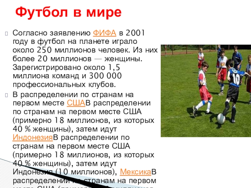 около 250 миллионов человек. Из них более 20 миллионов — женщины. Зарегистрировано около 1,5 миллиона команд и 300 000 профессиональных клубов.
