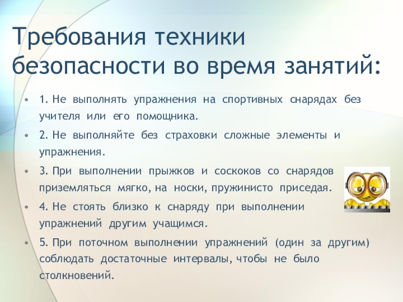 Требования техники безопасности во время занятий:1. Не выполнять упражнения на спортивных снарядах без учителя или его помощника.2.