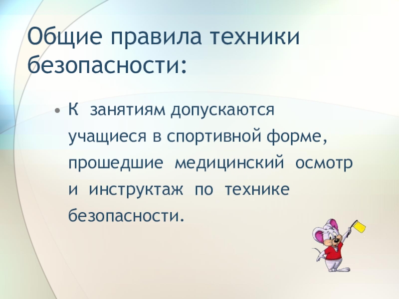 Общие правила техники безопасности: К занятиям допускаются учащиеся в спортивной форме, прошедшие медицинский осмотр и инструктаж по