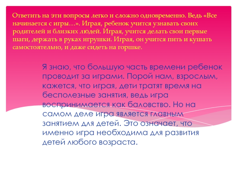 Ответить на эти вопросы легко и сложно одновременно. Ведь «Все начинается с игры…». Играя, ребенок учится узнавать своих родителей и близких людей. Играя, учится делать свои первые шаги, держать в руках игрушки. Играя, он учится пить и кушать самостоятельно, и даже сидеть на горшке.